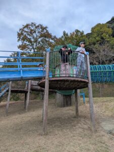 最初は寒い~と言っていた子どもたちも、鬼ごっこで走り回るとすぐにぽかぽかに♪ 遊具を使って上手く鬼から逃げる子どもたちです。
