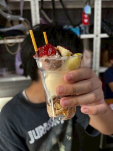 好きなフルーツや、クリーム、アイス、おやつなどをトッピングしていき、