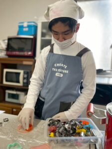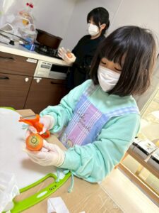 にんじん、じゃがいも、たまねぎの担当に分かれて、皮むきをしていきます。丁寧に皮むきをしていったら、食べやすい大きさにカット!