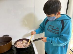 フライパンでたまねぎとお肉を炒めたら、全ての具材をお水の中にIN!✨️