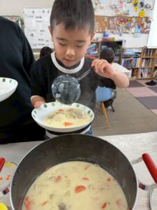 ルーを入れるとシチューの良い香りが…✨️「すごい!シチューだ!」「美味しそう!」という子どもたちの声が続々と聞こえてきました😊💕