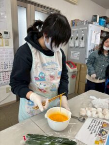 手巻き寿司の具材の1つである卵焼きでは、手分けして卵をたくさん割り、よく混ぜてからフライパンで焼いていきます。