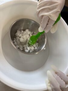 まず初めにろうを溶かしやすくするため、砕く作業から!